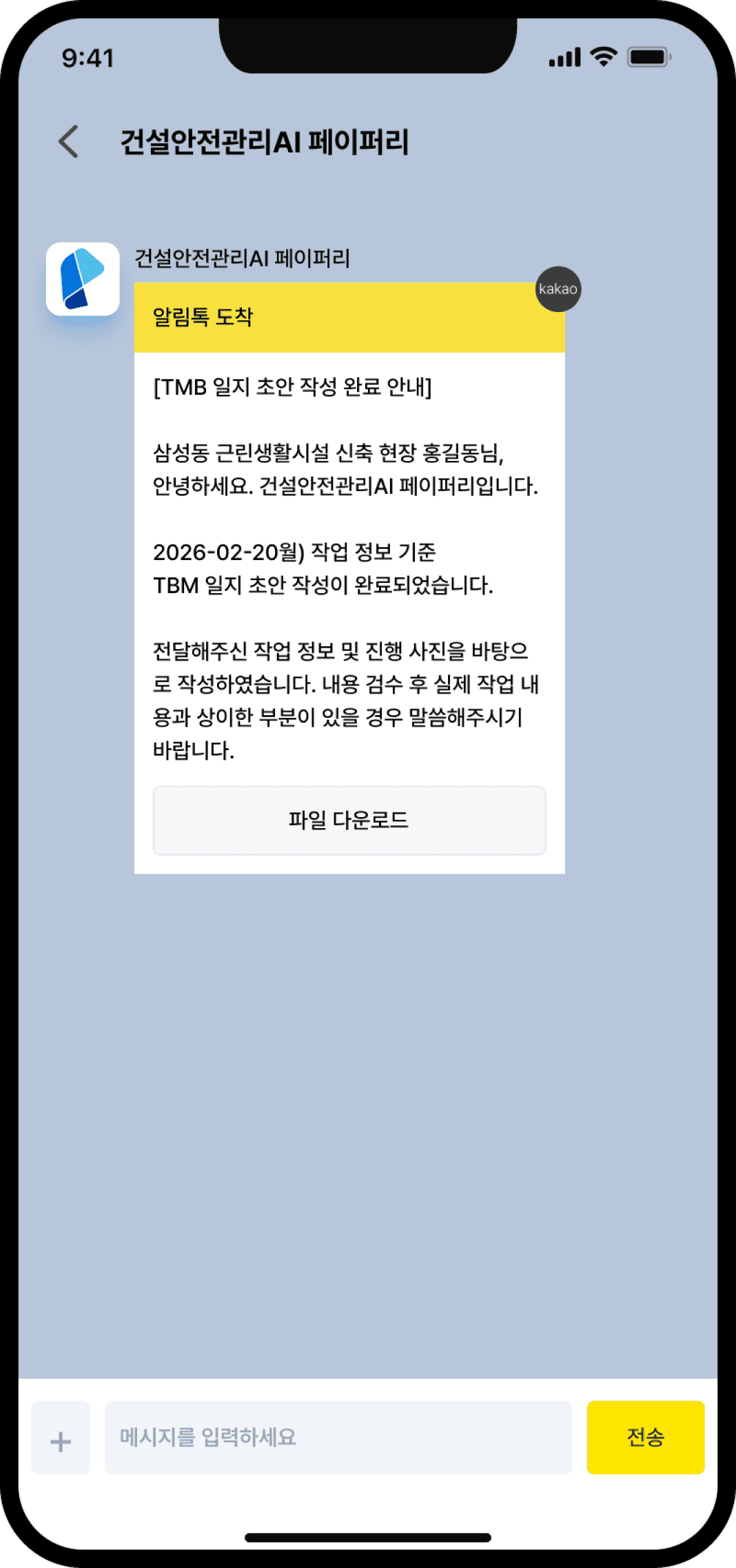 현장 관리자는 가장 익숙한 카카오톡으로 보고하고,